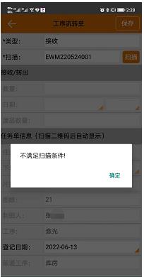 进入“工序流转单”后,点击“扫描”按钮,扫描“任务单”上的二维码;扫描二维码后,类型、任务单相关信息自动生成;接收时填写数量;转出时填写数量和废品数量。如下图: